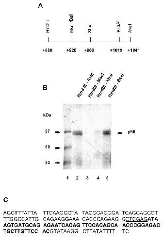Figure 3. Fine mapping of the p90 binding site.A Restriction map of the HindIII – AvaI region of c-mos 3'UTR cDNA. The position of the XhoI site introduced by mutagenesis is also indicated. Numbering is from the translation stop codon in the complete mRNA. B UV crosslink analysis of 32P-GTP-labeled transcripts that contain sequence information from different portions of the HindIII-AvaI regions of the c-mos 3'UTR cDNA, as indicated above the lanes. The position of the p90 protein is indicated on the right and the sizes of the molecular weight markers (lane 1) are indicated on the left. C The sequence of c-mos 3'UTR contained between the HindIII – AvaI restriction sites in the cDNA. The introduced XhoI site is underlined. The portion required for p90 binding is indicated in bold type.