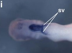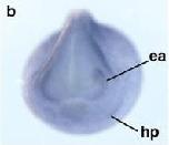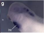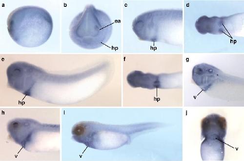 Figure 4. Expression pattern of Tbx5 in Xenopus tropicalis. The expression pattern of Tbx5 detected by in situ hybridization between late neurula and early tadpole stages is shown (uncleared except for g). a-j; Stages are as follows: stage 19 (a,b), stage 25 (c,d), stage 26 (e,f), stage 31/32 (g; cleared), stage 33 (h), and stage 40 (i,j). Except for the anterior view in b and the ventral view in j, embryos are oriented with anterior to the left. Anterior is to the top in j. ea, eye anlagen, hp, heart primordium, v, ventricle. |