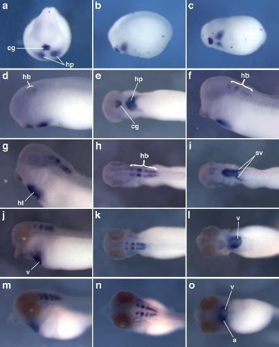 Figure 5. Expression pattern of Tbx20 in Xenopus tropicalis.The expression pattern of Tbx20 detected by in situ hybridization between late neurula and early tadpole stages is shown (embryos uncleared). a-o: Stages are as follows: stage 20 (a-c), stage 25 (d,e), stage 29/30 (f), stage 33 (g-i), stage 36 (j-l), and stage 40 (m-o). Ventral views are shown in i, l, and o. Except for the anterior view in a, embryos are oriented with anterior to the left. a, atrium; cg, cement gland; hb, hindbrain; hp, heart primordium; ht, heart tube; sv, sinus venosus; v, ventricle. |