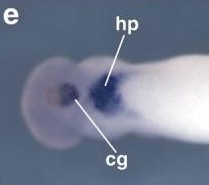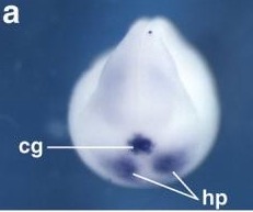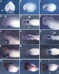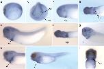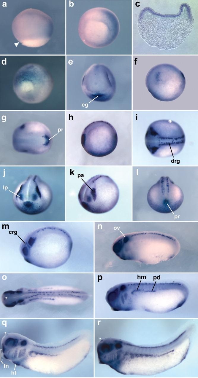 Figure 3. Expression pattern of Tbx2 in X. tropicalis. In situ hybridization results are shown for Tbx2 (embryos uncleared). a-c: Expression at early gastrula (stage 10.5) is shown in lateral (a) and vegetal (b) views of whole-mount embryos and in transverse section (c; ventral to the right). In both a and b, the embryo is oriented with dorsal to the left and the dorsal blastopore lip is indicated by an arrowhead in a. d: A vegetal view of a late gastrula (st12) is shown, ventral side uppermost. e-r: Expression at early neurula (stage 13; e-g) late neurula (stage 19; h,l), and tail bud stages 21/22 (m), 25 (n), 26 (o,p), 29 (q), and 33 (r) are also shown. Expression in the forebrain (telencephalon) at tail bud stages is indicated by an asterisk (o-r). Except for anterior (j) and posterior (d,l) views, all embryos are oriented with anterior to the left. cg, cement gland; crg, cranial ganglia; drg, dorsal root ganglia; fn, frontonasal process; hm, hypaxial muscle; ht, heart tube; lp, lens placode; ov, otic vesicle; pa, placodal area; pd, pronephric duct; pr, proctodeum. |