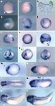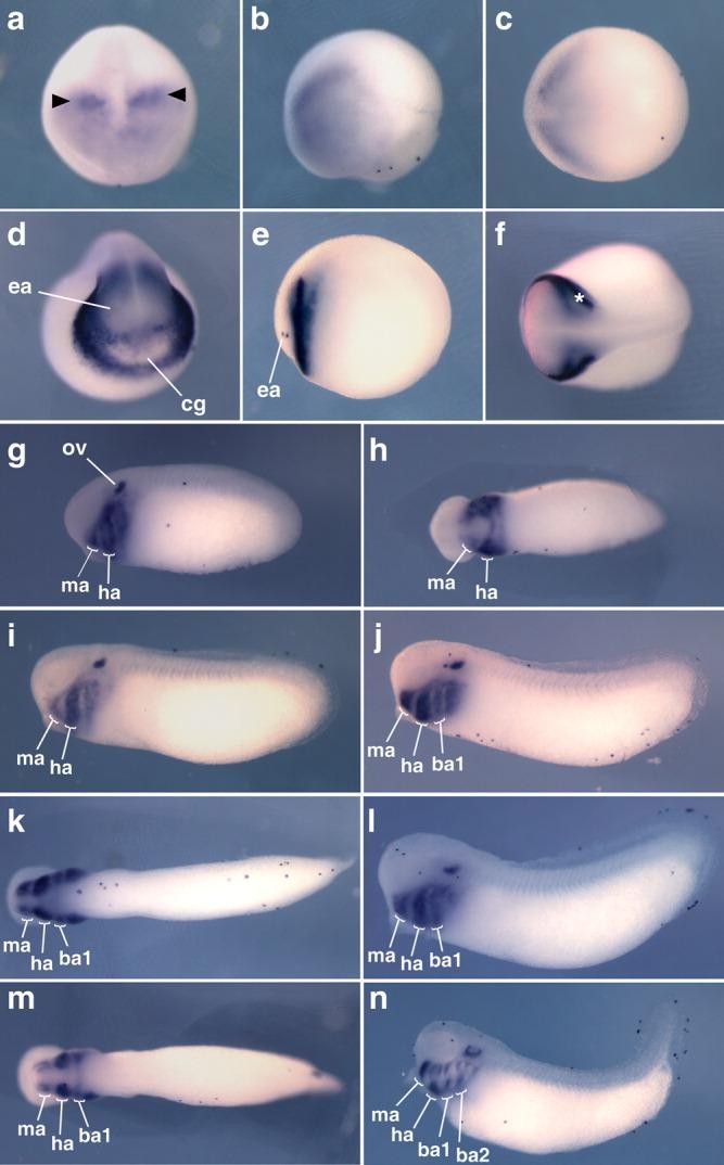 Figure 2. Expression pattern of Tbx1 in Xenopus tropicalis. The results of in situ hybridizations for Tbx1 expression from early neurula to late tail bud stages are shown (embryos uncleared). Except for the anterior views shown in a and d, all embryos are oriented with anterior to the left. a-c: Stage 13 is shown in anterior (a), lateral (b), and dorsal (c) views. Bilateral patches of stronger expression are indicated in a) by arrowheads. d-f: Stage 19 is shown in anterior (d), lateral (e), and dorsal (f) views. Bilateral stripes of stronger expression are indicated in f) by an asterisk. g-n: Tbx1 expression through tail bud stages is shown as follows: stage 25 lateral (g) and ventral (h), stage 26 lateral (i), stage 27 lateral (j) and ventral (k), stage 28 lateral (l) and ventral (m), stage 33 lateral (n). ba1, first branchial arch; ba2, second branchial arch; cg, cement gland; ea, eye anlagen; ha, hyoid arch; ma, mandibular arch; ov, otic vesicle. |