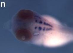 tbx20 (T-box 20) gene expression in head and trunk regions of Xenopus laevis embryo, assayed via in situ hybridization, NF stage 40, dorsal view, anterior left. |