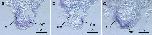 Figure 6. Cardiac expression of Tbx2, Tbx5, and Tbx20. The in situ hybridization patterns of Tbx2, Tbx5, and Tbx20 in the forming cardiac chambers were examined in transverse sections through the tadpole heart after looping. a: Tbx2 expression was seen in the myocardium of both the atrial (am) and ventricular (vm) regions of the looped heart at stage 36. b: Expression of Tbx5 was restricted primarily to the developing ventricular myocardium at stage 38. c: In contrast to Tbx5, high levels of Tbx20 expression were seen in the atrial region but not in the ventricle (stage 40). Original magnification, 00. |