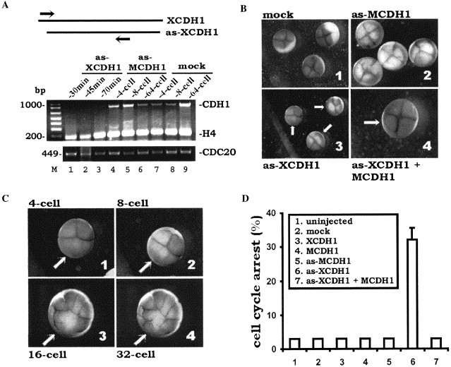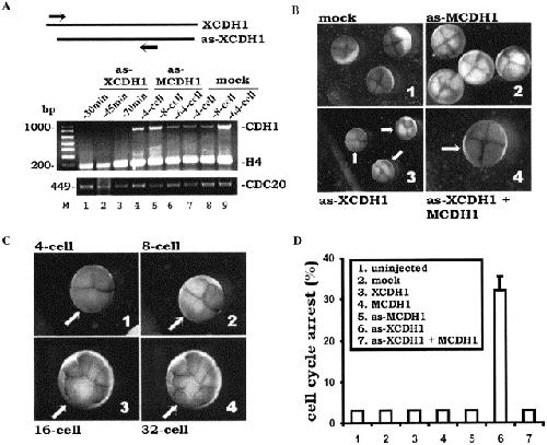 Xenopus CDH1 is essential for early embryonic cell cycles. (A) Depletion of endogenous XCDH1 transcript by as-XCDH1 RNA. Both blastomeres of the 2-cell stage embryos were injected with 4 ng as-XCDH1 RNA (lanes 1â3), 4 ng as-MCDH1 RNA (lanes 4â6), or PBS (mock, lanes 7â9). Injected embryos were collected at indicated time (30, 45, and 70 min after injection) or stages (4-cell, 8-cell, and 64-cell), and RT-PCR was performed as in Fig. 1. Sequences for the XCDH1 primers are 5â²-CTACGTGTCT CTATCTGCAA-3â² and 5â²-AAGATCATCCT GTCCCTACTC-3â² (900 bp fragment). Arrows indicate the annealing positions of the primers. It is noteworthy that the forward primer anneals to the endogenous XCDH1 mRNA, but not to the injected as-XDH1 RNA. (B) Loss of XCDH1 function induces cell cycle arrest: representative images of embryos. One blastomere of the 2-cell stage embryos was injected with PBS (mock; panel 1), 4 ng as-MCDH1 RNA (panel 2), 4 ng as-XCDH1 RNA (panel 3), or 4 ng as-XCDH1 RNA + 4 ng MCDH1 RNA (panel 4). Images were photographed at the 4-cell stage. Arrows indicate the injected side. (C) Persistent cell cycle arrest induced by XCDH1 depletion. An as-XCDH1-injected embryo was followed for 4 consecutive divisions (4-cell, 8-cell, 16-cell, and 32-cell). (D) Graphic quantitation of the cell cycle arrest phenotype induced by XCDH1 depletion. Each of the 7 indicated groups had 20â30 embryos. Percentages of embryos that showed the phenotype of cell cycle arrest as in panel 3 of B were calculated. Each bar represents the average values from four experiments.