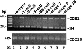 Expression of CDH1 mRNA in Xenopus oocytes and embryos. RT-PCR was performed with sub-saturating amounts of templates and the amplification was in the linear range. Histone H4 was co-amplified as an internal control. Amplification signals for Xenopus CDC20 from the same samples were shown for comparison. Results are representative of duplicate amplifications of three independent preparations of RNA. Sequences for the PCR primers are: H4: 5′-CGGGATAACATTCAGGGTA TCACT-3′+5′-ATCCATGGCG GTAACTGTCTTCCT-3′ (188 bp fragment); CDH1: 5′-ACAG ACTGAAGATAGACGAC-3′+5′-AAGATCATCCT GTCCCTACTC-3′ (551 bp fragment); CDC20: 5′-CGTCTTCGTAATATGATCAG -3′+5′-AGACCATACTATG GAGCAC-3′ (449 bp fragment).