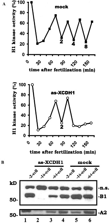 Loss of CDH1 function in early embryonic cell cycles leads to prolonged arrest with low CDK activity. (A) Time course of histone H1 kinase activity immuno-precipitated with an antibody to CDK1. Both blastomeres of the 2-cell stage embryos were mock-injected with PBS (mock; upper panel), or injected with 4 ng as-XCDH1 RNA (lower panel). Five embryos from each group were collected and lysed every 15 min. The lysates were immunoprecipitated with anti-CDC2/CDK1 antibody and the precipitates were assayed for relative histone H1 kinase activity. Cell numbers of the embryos are indicated. Experiments were repeated twice with similar results. (B) Western blot analysis of cyclins. Five embryos were collected at each of the indicated stages. B1: cyclin B1. A2: cyclin A2. n.s.: non-specific band. Experiments were repeated twice with similar results.