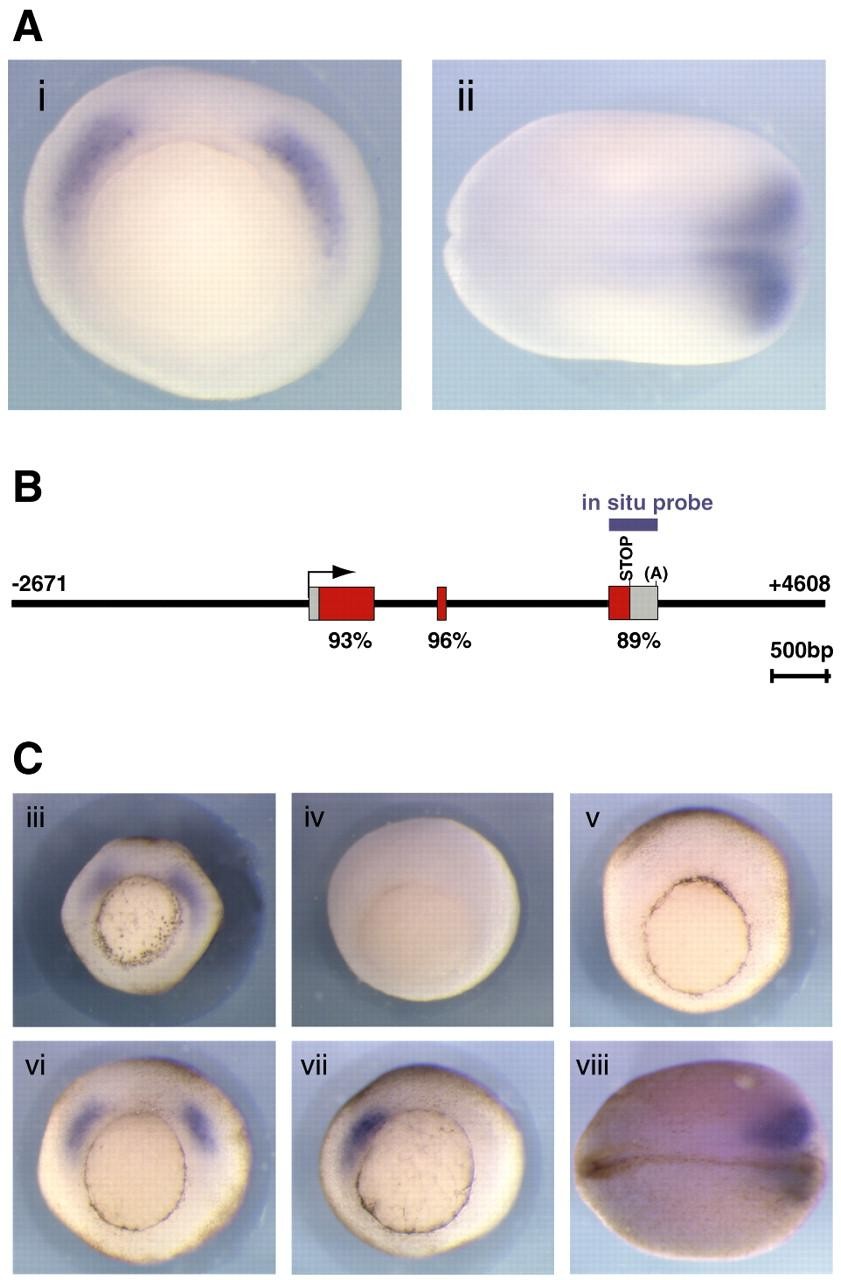 Fig. 1. (A) Expression of Xmyf-5 at the gastrula and neurula stages. Expression of Xmyf-5 was assayed in albino embryos by mRNA in situ hybridisation at the early gastrula/stage 10.5 (i) and late neurula/stage 19 (ii). (B) Schematic representation of XTM1, a 7.28 kb genomic fragment containing the X. tropicalis myf-5 gene. XTM1 is composed of 3 exons of 594 bp, 76 bp and 441 bp (untranslated regions shown in grey and coding sequence in red) separated by introns of 548 bp and 1445 bp. The start of transcription is indicated by an arrow. The percent similarities of the Xtmyf-5 exons with Xlmyf-5 are shown below each exon. A X. tropicalis myf-5-specific in situ hybridisation probe was raised to the third exon. (C) The expression of XTM1 in transgenic X. laevis embryos. (iii) Non-transgenic X. tropicalis embryo at stage 10.5 stained with species-specific Xtmyf-5 probe. (iv, v) Non-transgenic albino (iv) and pigmented (v) stage 10.5 X. laevis embryos stained with the species-specific Xtmyf-5 probe; note lack of staining. (vi, vii and viii) XTM1 transgenic X. laevis embryos at stage 10.5 (vi and vii) and stage 19 (ix), stained with the species-specific Xtmyf-5 probe. Note that the embryo in vii is half-transgenic, demonstrating the specificity of the XTM1 probe. Gastrula embryos are orientated with the dorsal axis pointing up and vegetal pole facing out. The neurula stage embryos are shown with the dorsal axis pointing out and anterior to the left.