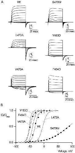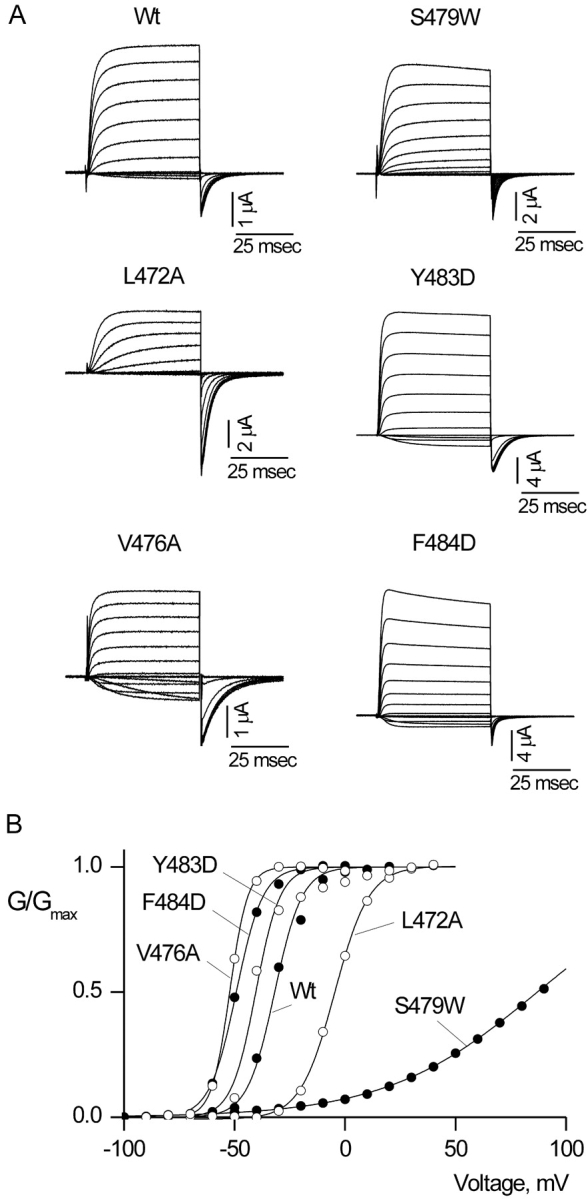 Figure 2. . Shaker Kv channel mutants with intact voltage-dependent gating. (A) Families of ionic current records for Wt and five mutant Shaker channels. For Wt Shaker, holding voltage was −90 mV, tail voltage was −70 mV, and depolarizations were from −70 to 50 mV, in 10-mV increments. For S479W, holding voltage was −100 mV, tail voltage was −100 mV, and depolarizations were from −100 to 90 mV, in 10-mV increments. For L472A holding voltage was −100 mV, tail voltage was −70 mV, and depolarizations were from −70 to 40 mV, in 10-mV increments. For Y483D, holding voltage was −90 mV, tail voltage was −70 mV, and depolarizations were from −70 to 40 mV, in 10-mV increments. For V476A holding voltage was −100 mV, tail voltage was −130 mV, and depolarizations were from −90 to 40 mV, in 10-mV increments. For F484D, holding voltage was −100 mV, tail voltage was −80 mV, and depolarizations were from −80 to 50 mV, in 10-mV increments. In all cases, depolarizations were 50 ms in duration. Linear capacity and background conductances were identified and subtracted by blocking the Shaker channel with Agitoxin-2. (B) G-V relations for Wt and five mutants. Normalized tail current amplitudes, measured at voltages indicated in A, are plotted versus the voltage of the preceding depolarization. Smooth curves are single Boltzmann fits to the data with parameters as follows: Wt: V50 = −31.8 mV, z = 4.1; V476A: V50 = −52.2 mV, z = 6.1; F484D: V50 = −49.2 mV, z = 4.2; Y483D: V50 = −40.4 mV, z = 4.6; L472A: V50 = −4.7 mV, z = 3.3; S479W: V50 = 87.7 mV, z = 0.7. |