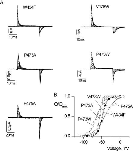 Figure 3. . Gating currents and Q-V relations for Shaker Kv channels with nonconducting phenotypes. (A) Families of gating current records for W434F and four other nonconducting mutant Shaker channels. In all cases, membrane voltage was depolarized to various test voltages and then repolarized to the holding voltage. For W434F, holding voltage was −90 mV and depolarizations were from −90 to 0 mV, in 10-mV increments. For V478W, holding voltage was −90 mV and depolarizations were from −80 to 20 mV, in 10-mV increments. For P473A, holding voltage was −100 mV and depolarizations were from –100 mV to −5 mV, in 5-mV increments. For P473W, holding voltage was –110 mV and depolarizations were from −110 to −20 mV, in 10-mV increments. For P475A, holding voltage was −100 mV and depolarizations were from −100 to 0 mV, in 10-mV increments. A P/−4 protocol was used to subtract leak and linear capacitive currents. (B) Normalized Q-V relations for W434F and three other nonconducting mutant Shaker channels. Q was obtained by integrating both the ON and OFF components of gating current, taking their average and normalizing to Qmax measured at depolarized voltages. Smooth curves are single Boltzmann fits to the data with parameters as follows: W434F: V50 = −47.1 mV, z = 4.1; P473W: V50 = −64.1 mV, z = 2.5; P473A: V50 = −55.9 mV, z = 7.0; V478W: V50 = −48.6 mV, z = 4.1; P475A: V50 = −41.1 mV, z =1.7. |