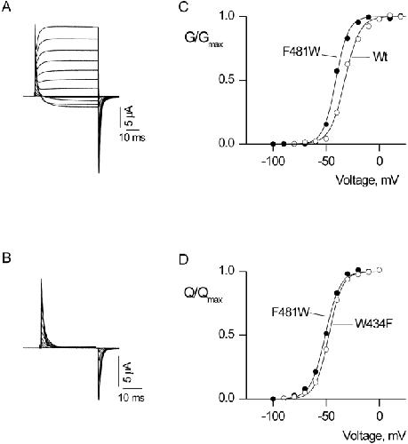 Figure 4. . Ionic and gating currents for a weakly conducting mutant Shaker Kv channel. (A) Family of ionic current records. Holding voltage was −100 mV, tail voltage was −100 mV, and depolarizations were from −100 to 50 mV, in 10-mV increments. A P/−4 protocol was used to subtract leak and linear capacitive currents. (B) Family of gating currents recorded in the presence of 1 μM Agitoxin-2. Membrane voltage was depolarized for 30 ms to various test voltages (−100 to 10 mV) and then repolarized to the holding voltage (−100 mV). A P/−4 protocol was used to subtract leak and linear capacitive currents. (C) G-V relations for Wt and F481W. Conductance was calculated from the amplitude of steady-state current before repolarization, normalized and plotted versus voltage. Smooth curves are single Boltzmann fits to the data with parameters as follows: Wt: V50 = −32.8 mV, z = 3.7; F481W: V50 = −41.3 mV, z = 4.4. (D) Normalized Q-V relations for W434F and F481W. Q was obtained by integrating both the ON and OFF components of gating current, taking their average and normalizing to Qmax measured at depolarized voltages. Smooth curves are single Boltzmann fits to the data with parameters as follows: W434F: V50 = −47.2 mV, z = 4.1; F481W: V50 = −50.2 mV, z = 3.6. |