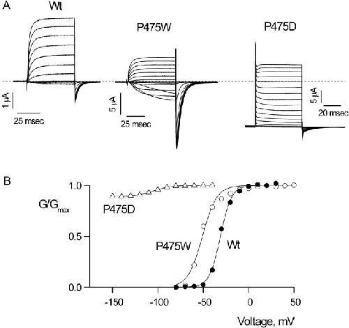Figure 5. . Constitutive conduction in the P475D mutant of the Shaker Kv channel. (A) Families of ionic currents for Wt, P475W, and P475D. For Wt, holding voltage was −90 mV, tail voltage was −70 mV, and depolarizations were from −70 to 90 mV, in 10-mV increments. For P475W, holding voltage was −100 mV, tail voltage was −100 mV, and depolarizations were from −100 to 50 mV, in 10-mV increments. For P475D, the holding voltage was −110 mV and membrane voltage was stepped to −150 mV for 200 ms before recording the traces shown. Tail voltage was −150 mV, and depolarizations were from −150 to 20 mV, in 10-mV increments. In the case of P475D, the extracellular solution contained 50 mM K+ instead of Rb+. Linear capacity and background conductances were identified and subtracted by blocking the Shaker channel with Agitoxin-2. Dashed line indicates the position of zero current. (B) G-V relations for Wt, P475W, and P475D. Normalized tail current amplitudes are plotted versus the voltage of the preceding depolarization. Smooth curves are single Boltzmann fits to the data with parameters as follows: Wt: V50 = −31.0 mV, z = 4.2; P475W: V50 = −50.9 mV, z = 3.2; P475D: V50 = −103.2 mV, z = 3.0. |