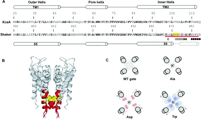 Figure 1. . Sequence comparison between KcsA and the pore domain of the Shaker Kv channel. (A) Sequence alignment of the KcsA K+ channel with the pore domain of the Shaker Kv channel. Diagram above indicates secondary structural motifs in KcsA. TM1 and TM2 correspond to S5 and S6 in Kv channels, respectively. Residues in bold are highly conserved between KcsA and Shaker. Circles below Shaker sequence diagram results of gated accessibility studies with thiosulfonates (Liu et al., 1997). Positions with open circles display more rapid reaction in the open state and those with closed circles indicate rapid reaction in either closed or open states. Half-filled circles display intermediate differences in reaction rate between closed and open states. Red underline highlights the regions examined in the present study with the PVP motif highlighted in yellow. (B) Backbone fold of KcsA shown from the side. Positions shown in red and yellow correspond to the residues in S6 that are the focus of the present study. (C) Illustration of several possible phenotypes that might be expected for mutation of residues located in a tightly packed region of the closed state. The hypothetical gate residue is represented with an isoleucine. Mutation to the smaller Ala might allow K+ flux through the closed gate, whereas mutation to a charged residue like Asp might trap the gate open. Substitution with large side chains (e.g., Trp) might occlude the open gate (not illustrated) or sterically trap the gate open. |