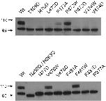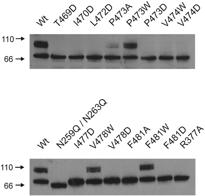 Figure 6. . Mutant Shaker Kv channels with defects in maturation. Western blots from SDS poylacrylamide gels of c-mycâtagged Shaker protein obtained from crude oocyte membrane preparations. Each lane contains between 4 to 10 oocyte equivalents of Shaker protein. Wild-type protein has two dominant forms, a core-glycosylated species (band â¼70 kD) and a more heavily glycosylated mature form (broad band at â¼100 kD). The N259Q/N263Q double mutant shows only a single band at â¼65 kD and marks the position of the unglycosylated protein. Numbers to the left are molecular weight markers in kD. See materials and methods for details. |