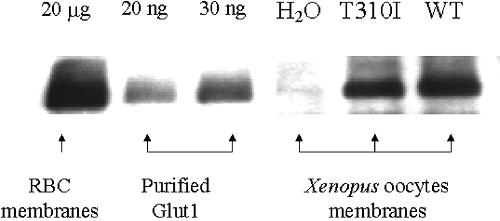 We studied glucose and water passage across wild type (WT) glucose transporter Glut1 and its T310I pathogenic mutant, expressing them in Xenopus laevis oocytes. We found that the T310I mutation produced a 8-fold decrease in glucose transport (zero-trans influx, 13 +/- 2% compared with WT), accompanied by a 2.8-fold increase in the osmotic water permeability (P(f) 280 +/- 40% compared with WT), and no change in the diffusional water permeability (P(d)). The dependence of glucose and water transports on the amounts of mutant cRNA injected was identical exponential buildups (k = 19.7 ng), suggesting that they depend similarly on the quaternary structure. The E(a) values for P(f) were 16 +/- 0.4 (WT) and 11 +/- 1 kcal mol(-1) (T310I). We report for the first time that 10 mm d-glucose and l-glucose inhibit P(f) by approximately 45% in the WT but not in the T310I mutant. In addition, 10 mm maltose reduces P(f) (15-20%) in both cases. However, 5 mm l-glucose increased the P(f) of T310I, consistent with a cooperative effect. These experimental observations and an analysis of our three-dimensional model strongly suggest the presence of two channels per Glut1 monomer, one of which can be blocked by the mutation T310I.