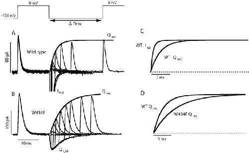 Figure 1. . Rate of gating charge recovery in wild-type and W434F mutant channels. The rate of charge recovery was assessed by using a double pulse protocol. A pair of pulses to 0 mV was applied to inside-out patches separated by varying durations at −100 mV. Both the external and internal solutions contained 1 mM K+ + 115 mM Tris+ to achieve a reversal potential of 0 mV. (A) The depolarizing pulse to 0 mV evokes an ON gating current, then large inward tail currents are seen through the wild-type channels during the repolarizing pulse, and the ON gating current in the second pulse recovers with increasing interpulse durations. (B) Only the OFF gating current is present in the nonconducting mutant during repolarization. (C) Direct comparison of the rate of tail current decay and that of charge recovery in the wild-type channel indicates that channel closing is fast compared with charge return. The actual normalized tail current trace and the fit to the recovering second ON gating currents from A are shown. (D) Charge recovery is significantly faster in the wild-type channels (tau = 2.5 ms for this patch) than in the W434F mutant (tau = 5.9 ms for this patch). The fits were taken from A and B and are shown normalized for direct comparison. |