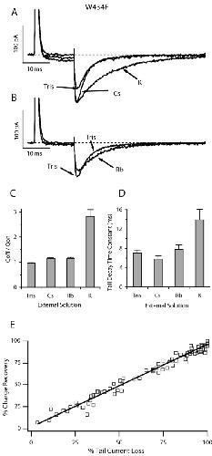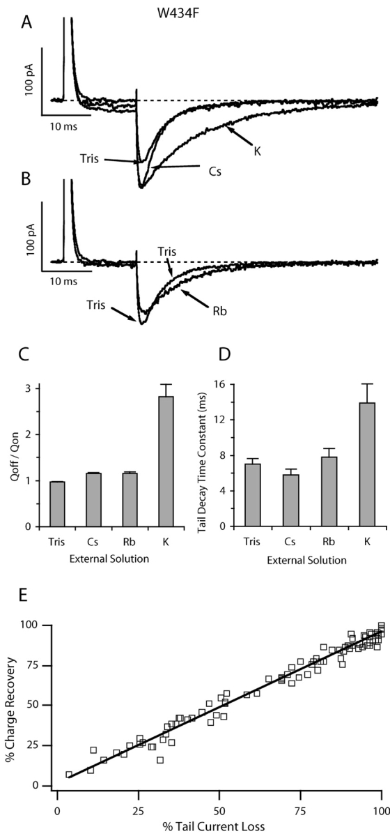 Figure 4. . Low permeation and slow channel closing in W434F. (A and B) The external side of an outside-out patch was exposed to solutions containing 115 mM K+, Cs+, Rb+, or Tris+, whereas the pipette solution (internal solution) contained 115 mM Tris+. Traces on A and B are from the same patch and are only separated for clarity. Currents were elicited by a 15-ms step to 0 mV from a holding potential of −100 mV, followed by a step back to −100 mV. For external Tris+, only the ON and OFF gating currents are seen during depolarizing and repolarizing steps, respectively. By contrast, small inward currents are also seen during the depolarizing step in the other external solutions, which increase to noticeable tail currents during the repolarizing step. (C) The ratio of the integrated charge in the OFF gating + tail current to that in the ON gating current indicates significant permeation only with 115 K+ in the external solution (QOFF/QON = 2.82 ± 0.27, n = 8). (D) The decay of the tail current was significantly slower in K+ than in other conditions. In other external ions, tail decay rate consistently showed the following sequence: Cs+ > Tris+ > Rb+, but these differences were not statistically significant. (E) The relationship between gating charge recovery and channel closure in the mutant channel is linear in 115 K+O// 115 Tris+I solutions. The figure was prepared as described in the legend to Fig. 2. |