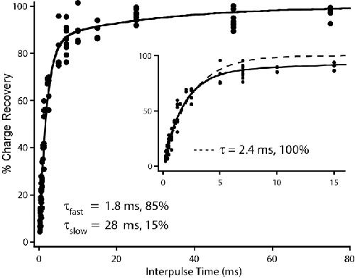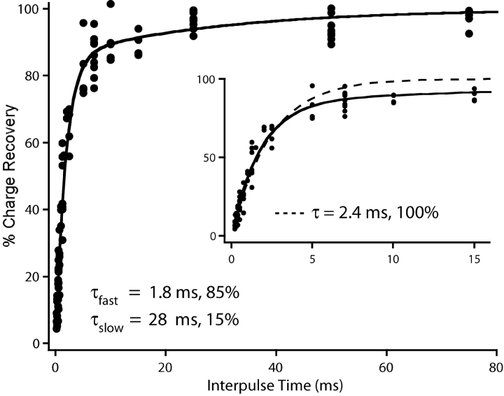 Figure 6. . The slow component of charge return becomes apparent in scatter plots. The fraction of recovered gating charge is plotted as a function of the interpulse duration used in the double pulse protocol. A single exponential fit to all data points yields a time constant of 2.4 ms, but this function gives a poor fit for interpulse durations over 5 ms (inset, dashed line). A double exponential fit with fast and slow time constants of 1.8 and 28 ms and relative weights of 85 and 15%, respectively, fits the data points well (solid line in both figure and inset). This scatter plot contains data recorded in symmetrical 1 K+ + 115 Tris+ solutions from 29 patches containing wild-type channels. |