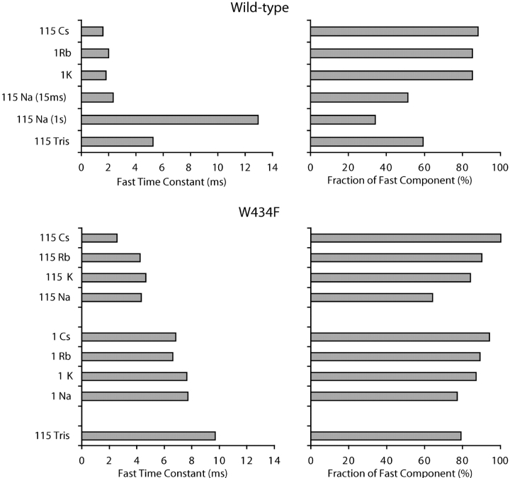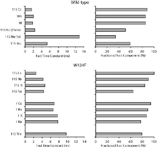 Figure 7. . Fast time constants of charge recovery and their relative weights in wild-type and mutant channels. Data were obtained from double exponential fits to scatter plots in the indicated ionic conditions. Symmetrical solutions were used and the labels indicate the main cation and its concentration in mM in both solutions. When a concentration of 1 mM was used for an ion, it was complemented by 115 mM Tris+. For most conditions, the slow time constant fell in the 18–30 ms range. When in some conditions the double exponential fit yielded unreasonably slow time constants, it was constrained within this range to get meaningful values. This did not affect the quality of the fit. For this reason the slow time constants are not shown in the figure. For the wild-type channel, the values in parentheses for the 115 Na+ condition indicate the duration of the first depolarizing pulse in the double pulse protocol. |