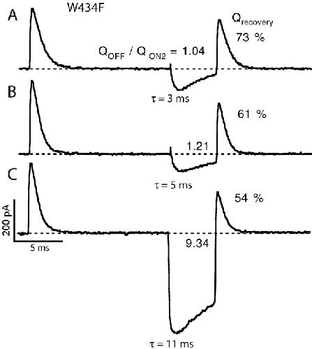 Figure 13. . W434F channels are slow to enter the C-inactivated state. Traces were recorded in symmetrical 115 Na+ solutions from an inside-out patch containing W434F channels. The standard double pulse protocol was used with (A) a 15-ms and (B) a 10-s first pulse duration. Despite the dramatic increase in the duration of the first pulse, little slowing in charge recovery is seen (15 ms first pulse: 83%, 10 s first pulse: 71%). The interpulse duration was 15 ms. The large Na+ tail currents were omitted from the figure for clarity. |