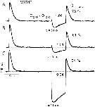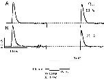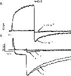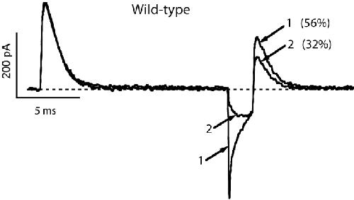 Figure 12. . Block of K+ conduction in the wild-type channel by external Ba2+ slows the rate of charge recovery. The traces were recorded from an inside-out patch in symmetrical 1 K+ + 115 Tris+ solutions with the addition of 2 mM Ba2+ in the pipette. From a holding potential of −100 mV a pair of pulses to 0 mV was applied, separated by 2 ms at −100 mV. Trace 1, recorded first, shows some fast inward K+ tail current and a greater amount of charge recovered in the second pulse (56%). As barium in the pipette solution diffuses into the channels, it blocks the potassium tail current, leaving only the OFF gating current (trace 2). Along with the disappearance of the tail current, a clear slowing of the charge recovery rate is visible in the second ON gating current (32%). |