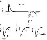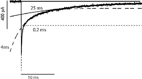 Figure 15. . The three components of Na+ tail currents in the wild-type channel. The trace was recorded in 115 Na+O//115 Na+I solutions from an inside out patch containing wild-type channels. The tail current was elicited by stepping back to −100 mV after a 15-ms long depolarizing pulse to 0 mV. The original data trace is shown with the three exponential components of the fit. The short dashed line indicates the fast component (τ = 236 μs, channels closing from the open state), the long dashed indicates the intermediate component (τ = 4.3 ms, channels returning from I0), and the solid line indicates the slow component (τ = 25.5 ms, channels returning from IC1). |