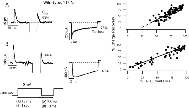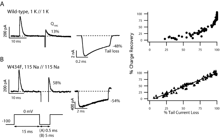 Figure 2. . Relationship between gating charge recovery and channel closure in the wild-type and the W434F channel. The percentage of gating charge recovery was determined using the double pulse protocol by calculating the ratio of the ON gating charge in the second pulse to that in the first pulse (left). Tail currents from the left panels are shown on the middle panels on a different time scale. Solutions used in the experiments were (A) symmetrical 1 K+ + 115 Tris+ for wild-type and (B) symmetrical 115 Na+ for W434F channels. (A) In the wild-type channel the relationship between charge recovery and channel closing is nonlinear in 1 K+ solutions, (B) but it is linear in the W434F mutant in 115 Na+ solutions. In the wild-type, 13% of the charge recovered (A, left) while the tail current dropped 48% compared with its peak value (A, middle) in this patch; however, (B) in W434F a tail current loss of 54% was accompanied by 58% charge recovery. These results from many patches (WT: n = 29; W434F: n = 18) and various interpulse durations are summarized in the point plots (right). |