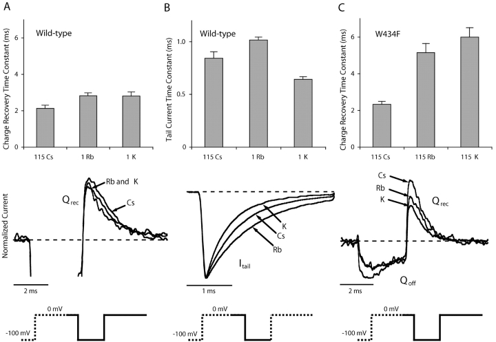 Figure 3. . Charge recovery and tail current time constants. (A, top) In the wild-type channel, charge recovery rates were similar in ionic conditions that produced different tail current decay rates (B, top). (A and B, middle) Different segments of the same three traces recorded during a double pulse protocol illustrate the similar amounts of gating charge recovery but different rates of tail current decay during the 3-ms interpulse interval in the three ionic conditions. The segments shown correspond to the solid line on the pulse pattern (bottom). The peak gating currents in the first depolarizing pulse were used to normalize the traces in A, and tail currents were normalized by their peaks in B. (C, top) In contrast to the wild-type channel, charge recovery time constants show a strong dependence on the ionic species in the W434F mutant. (C, middle) Recovery of gating currents in the indicated solutions from different patches is sensitive to ion species. Symmetrical solutions were used, and labels indicate the main cation and its concentration in mM. In 1 mM K+ and 1 mM Rb+ solutions, the substitute ion was 115 mM Tris+. Bars indicate the mean ± SEM of single exponential time constants determined for individual patches. The number of patches was as follows, wild-type: 115 Cs+, n = 16; 1 Rb+, n = 22; 1 K+, n = 29. W434F: 115 Cs+, n = 8; 115 Rb+, n = 10; 115 K+, n = 15. |