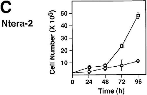 Figure 5. Expression of Spy1 increases the rate of proliferation of mammalian cells. Growth curves of (A) HeLa cells, (B) NIH3T3 cells, and (C) Ntera-2 cells. All cells were transiently transfected with myc–Spy1 (□) or empty vector (○). Cells were collected in triplicate at the indicated time point and counted via trypan blue exclusion. The graph is one representative experiment of at least three independent experiments. Error bars were calculated using SEM.
