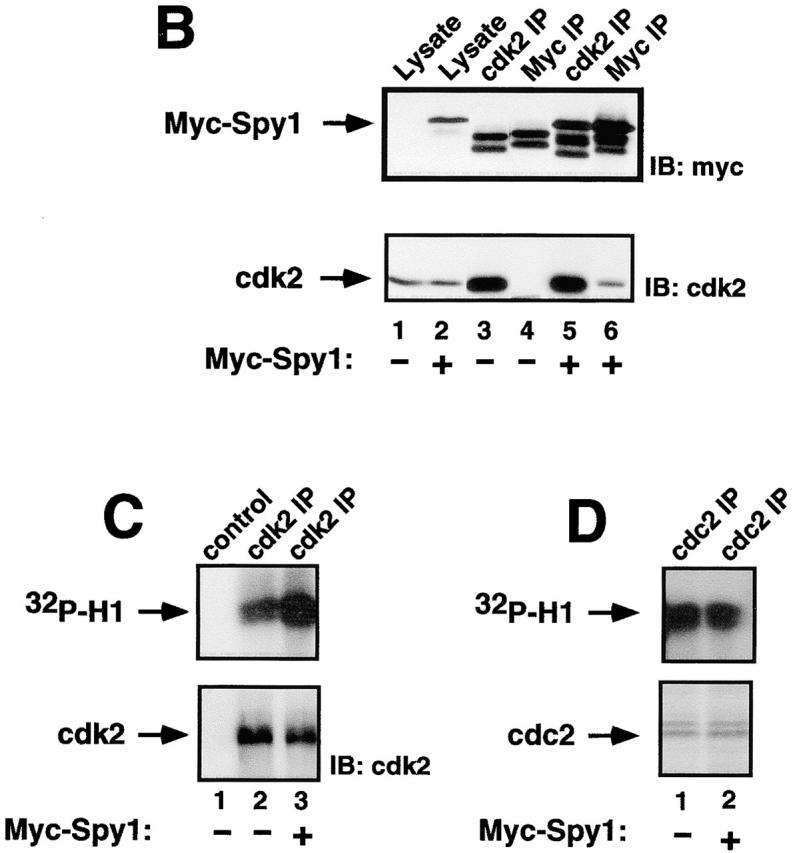 Figure 4. Human Spy1 binds to and activates cdk2. (A) Indirect immunofluorescence on COS-1 cells transiently transfected with human myc-tagged Spy1 (myc–Spy1; bottom left) or with empty vector (mock; top left) shows myc–Spy1 in the nucleus. The corresponding panels on the right are stained with Hoechst dye to illuminate the nuclei of all the cells present. (B) Coimmunoprecipitation of transiently transfected myc–Spy1 with endogenous cdk2 from 293T cells. Western blot analysis using antibodies against the myc epitope tag (top) or against cdk2 (bottom). Lane 1 is lysate from mock-transfected cells. Lane 2 is lysate from myc–Spy1-transfected cells. Lanes 3 and 4 are immunoprecipitations (IPs) from mock-transfected cells, and lanes 5 and 6 are immunoprecipitations from myc–Spy1-transfected cells using either anti-cdk2 (lanes 3 and 5) or anti-myc (lanes 4 and 6). (C) Top panel shows histone H1 phosphorylation assay. 293T cells were transiently transfected with empty vector (mock) or myc–Spy1. 24 h after transfection, cells were harvested and immunoprecipitated with antibodies against cdk2. Lane 1 is histone H1 alone (no IP). Lanes 2 (mock) and 3 (myc–Spy1) are cdk2 IPs. Bottom panel shows blot of cdk2 in IPs from mock and myc–Spy1 cells. (D) Top panel shows histone H1 phosphorylation assay. 293T cells were transiently transfected with empty vector (mock) (lane 1) or myc–Spy1 (lane 2). 24 h after transfection, cells were harvested and immunoprecipitated with antibodies against cdc2. Coomassie blue staining showing equal loading of cdc2 is presented in the bottom panel.