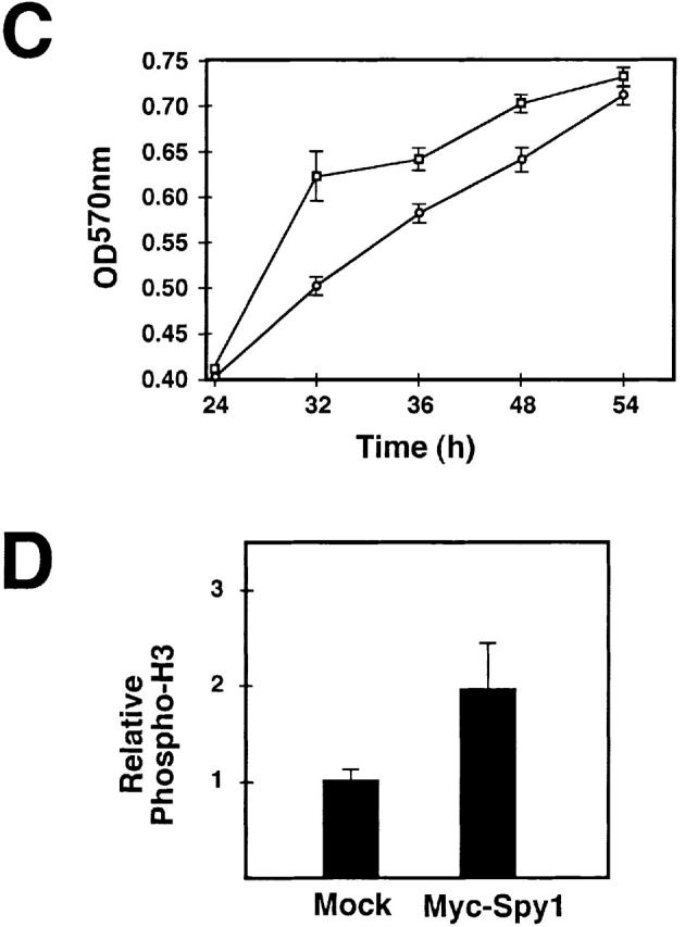 Figure 6. Expression of Spy1 increases both the rate of cell replication and division. (A) Growth curve of 293T cells transiently transfected with myc–Spy1 (□) or empty vector (○). Cells were collected at the indicated times, counted on a Coulter counter, and replated. The graph is the average of three independent experiments. Error bars were calculated using SEM. (B) Increase of BrdU incorporation in myc–Spy1-transfected 293T cells. Cells were harvested at day 2, stained for BrdU, and the positive cells were counted via fluorescence microscopy. Error bars represent the standard error of three experiments. (C) MTT analysis of 293T cells expressing myc–Spy1 (□) or empty vector (○). Cells were collected at the indicated times, treated, and then the absorbance was taken at 570 nm to determine the relative levels of MTT. Bars represent the standard error between four separate transfections within one representative experiment. (D) Histone H3 phosphorylation in myc–Spy1-transfected 293T cells. Cells were harvested at day 2, stained for phosphorylated histone H3, and the positive cells were counted via fluorescence microscopy. Bars represent the standard error of three separate experiments.