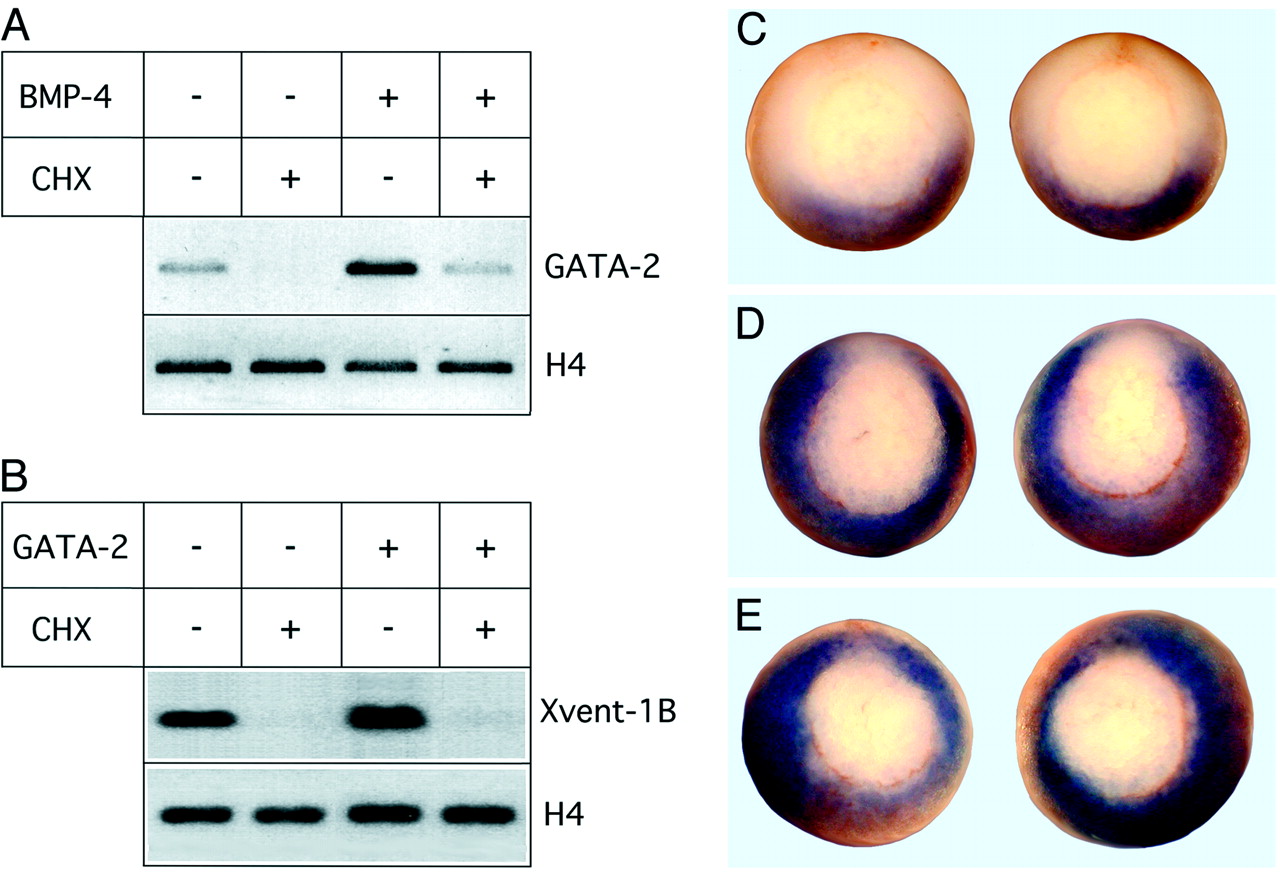 of GATA-2 RNA (D) or with 250 pg of Xvent-2 RNA (E). Embryos are