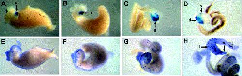 Fig. 3. Endocrine gene expression in isolated whole guts (AâD) Insulin expression. Initially expression is only seen in the dorsal (d) pancreas at stage 41. At stage 45 insulin expression is detected in several large groups of cells in the dorsal pancreas. By stage 47 expression is also seen in the ventral (v) pancreas. (EâH) Glucagon expression. Glucagon-expressing cells are first detected at stage 41 in the stomach. No expression is seen in the pancreas until stage 45, and by stage 47 large numbers of glucagon-expressing cells are present throughout the whole pancreas as well as the stomach and the intestine. Labels in figures are d for dorsal pancreas and v for ventralpancreas. (A,E) Stages 40â41. (B,F) Stages 42â44. (C,G) Stages 45â46. (D,H) Stages 47â48.