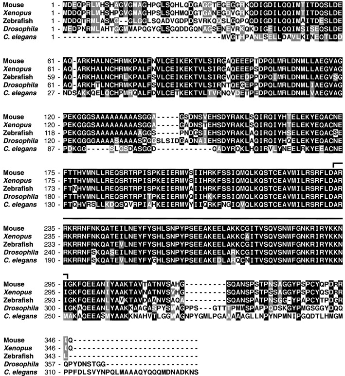 Figure 1 Xpbx1b encodes a TALE family homeodomain-containing protein. Amino acid comparison of the coding sequences of Xenopus Pbx1b, Mouse Pbx1b, Drosophila extradenticle, Zebrafish Pbx 4(Lazarus), and C. elegans Pbx (Ceh-20). Identical residues are shaded in black, conservative differences are shaded in gray, and white represents nonhomology. The bracketed area above the sequence denotes the homeodomain region.