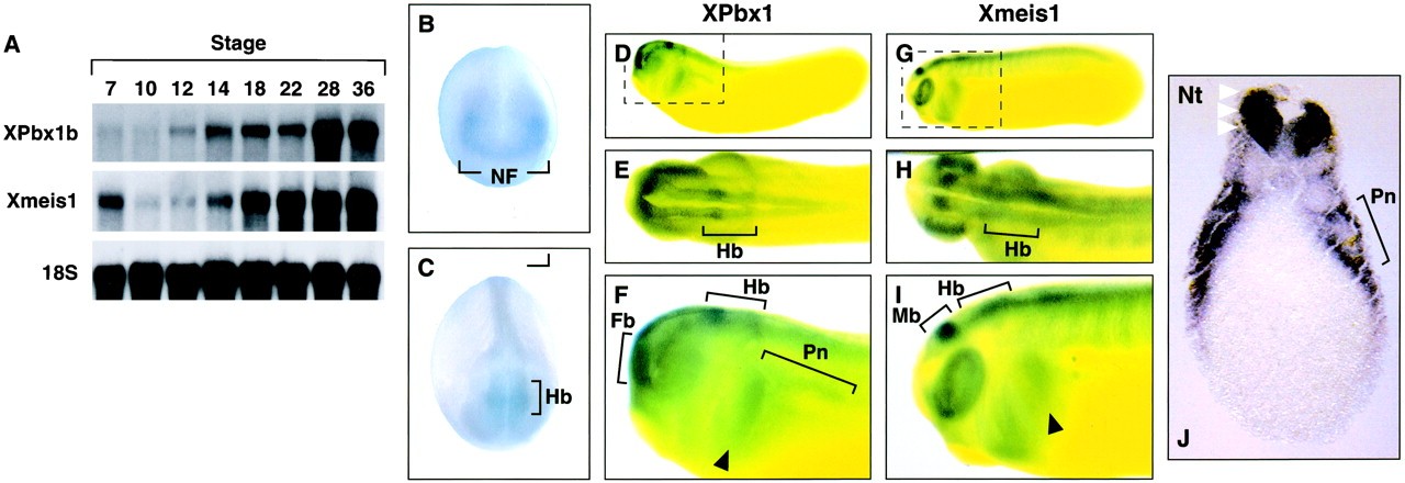 Figure 2 Temporal and spatial distribution of XPbx1b and Xmeis1 RNA expression during embryogenesis. (A) Northern blot analysis of RNA extracted from embryos at the indicated stages with Xpbx1b and Xmeis1 specific probe. The 18S RNA probe was used as a loading control. Whole mount in situ hybridization analysis of the tissue distribution of XPbx1b (BâF) and Xmeis1 (GâI) transcripts in X. laevis embryos. (B) Stage 15, anterior view. Note expression in lateral neural folds. (C) Stage 21, dorso-anterior view. Note strong staining in the presumptive hindbrain and along neural folds. (D) Lateral view of cleared stage-26 embryo. (E) Stage 26 dorsal view. (F) Enlarged lateral view of enclosure from D. Note the distinct Xpbx1 staining in the forebrain, hindbrain, and caudal branchial arch. (G) Lateral view of cleared stage-25 embryo. (H) Stage 25 dorsal view. (I) Enlarged lateral view of enclosure from G. Note strong expression of Xmeis1 in the midbrain, hindbrain, caudal and rostral branchial arches, and somites. (J) Transverse section through the pronephros of a stage-28 embryo. Note the strong Xpbx1 staining in lateral edge of neural tube (white arrowheads); expression also is observed in the lateralmesoderm surrounding the pronephritic anlage. (BâJ) Black arrowheads indicate caudal branchial arch. Black brackets denote the indicated tissues. Fb, forebrain; Hb, hindbrain; Mb, midbrain; NF, neural fold; Nt, neural tube; Pn, pronephros.