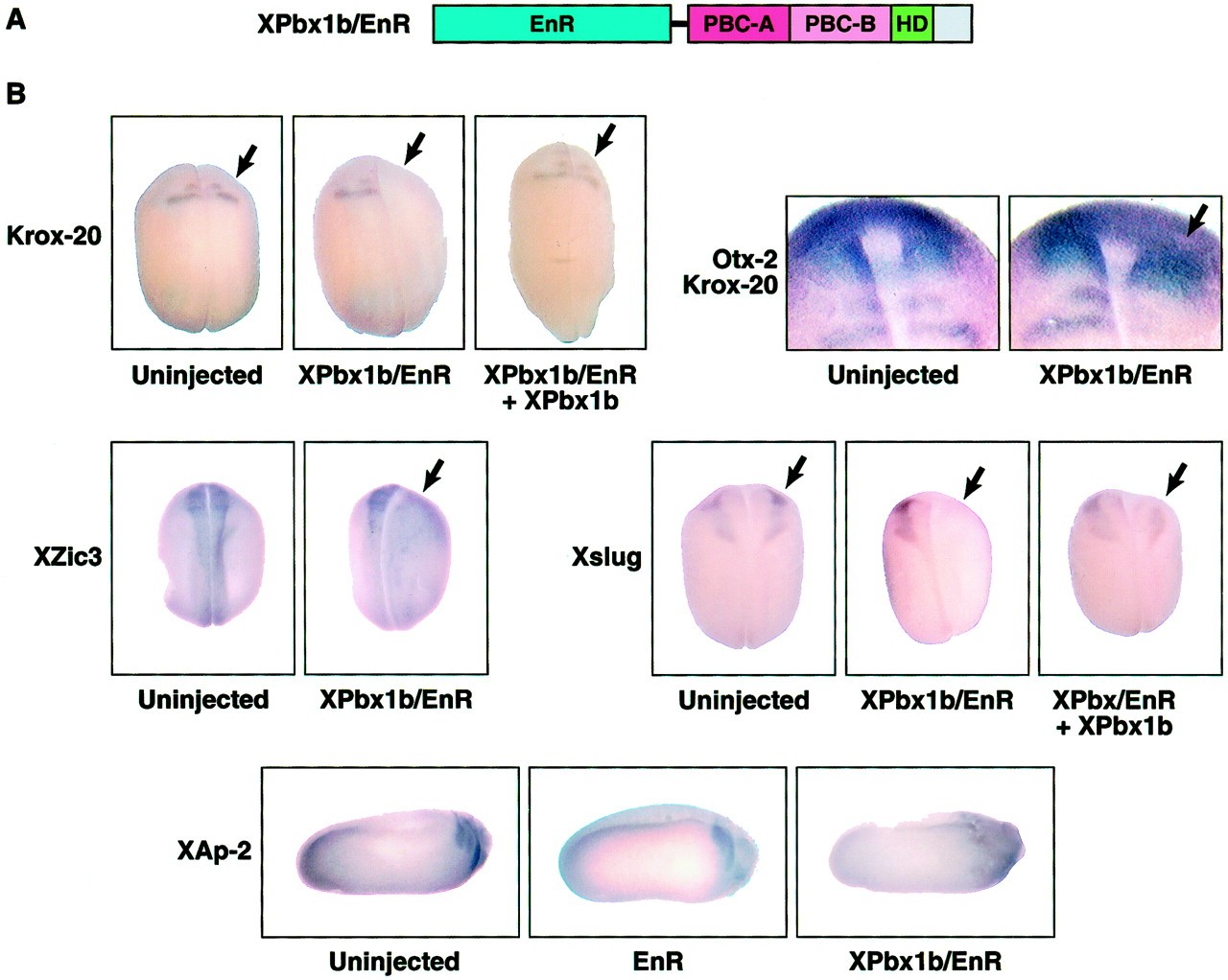 Figure 4 XPbx1b/EnR suppresses posterior neural and neural crest markers during embryonic development. (A) Schematic representation of XPbx1b protein fused with an Engrailed repressor domain. The three major conserved domains with vertebrate Pbx1 and C. elegans Ceh-20; PBC-A, PBC-B, and the homeodomain (HD) also are indicated. (B) One blastomere of two-cell stage embryos was either injected with XPbx1b/EnR RNA (0.75 ng per embryo) alone or coinjected with wild-type XPbx1b RNA (2.5 ng per embryo), as indicated. Engrailed control embryos were injected with EnR RNA (2.5 ng per embryo) as noted. Embryos were cultured until stage 16 (Xslug images), stage 18 (Krox-20, Krox-20/Otx-2, and Xzic3 images), or stage 24 (Xap-2 images). Embryos were fixed, and in situ hybridization was performed by using the indicated probe. Arrow indicates injected side of embryo. Note that XPbx1b/EnR suppressed Krox-20 (hindbrain), Xzic3 (proneural and neural crest), Xslug (neural crest), and Xap-2 (neural crest) expression on the injected side, but Otx-2 (anterior neural) expression remained. Also note that coexpression of wild-type Xpbx1b rescued Xslug and Krox-20 expression.