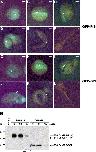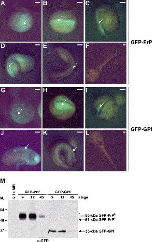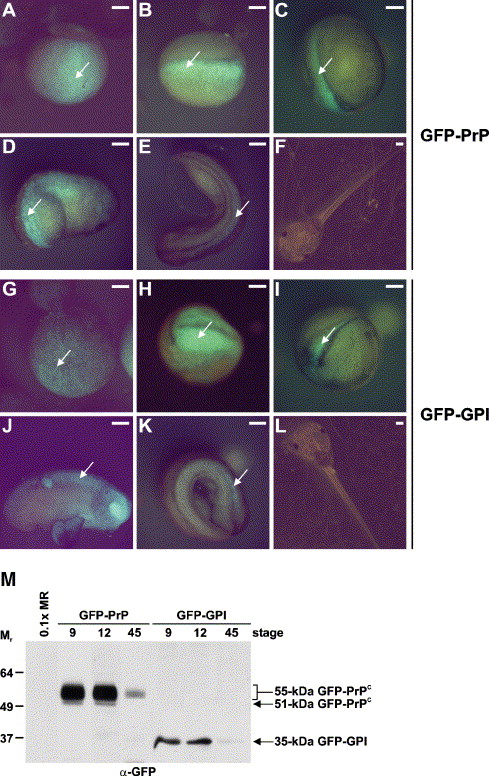Expression of GFP-PrPC and GFP-GPI fusion proteins in microinjected Xenopus embryos. In vitro synthesized GFP-PrP or GFP-GPI mRNA (1 ng) was microinjected into the animal pole of undivided fertilized Xenopus eggs. Expression of the GFP-PrPC (A–F) and GFP-GPI (G–L) fusion proteins was followed in time under a fluorescence microscope. Arrows indicate the sites of fusion protein expression. (A, G) Stage 9, (B, H) stage 12, (C, I) stage 14, (D, J) stage 22, (E, K) stage 26 and (F, L) stage 45 (staging according to Nieuwkoop and Faber (1967)). Scale bar equals 0.4 mm. (M) Western blot analysis of stage-9, -12 and -45 Xenopus embryos microinjected with 1 ng GFP-PrP mRNA, 1 ng GFP-GPI mRNA or 0.1× MR; an anti-GFP antibody (α-GFP) was used.