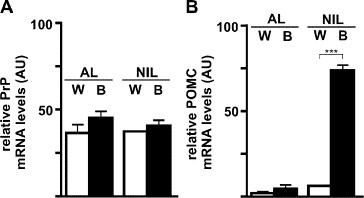PrP mRNA expression in the neurointermediate and anterior pituitary of black- and white-adapted Xenopus. PrP (A) and POMC (B) mRNA expression levels in the neurointermediate lobe (NIL) and the anterior lobe (AL) of the pituitary of black-adapted (B; black bars) Xenopus compared with those of white-adapted (W; white bars) animals were determined by real-time quantitative RT-PCR. All values were normalized to GAPDH mRNA levels and are expressed as means ± SEM (n = 3). A significant difference is indicated by *** (P < 0.001).