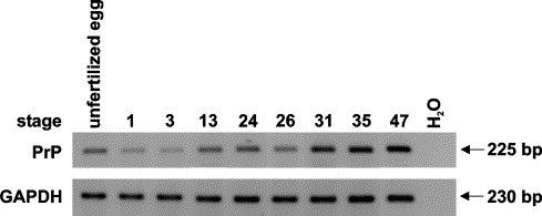 Temporal expression pattern of PrP during Xenopus development. Total RNA was extracted from embryos at the indicated developmental stages and used for RT-PCR analysis (staging according to Nieuwkoop and Faber (1967)). Glyceraldehyde-3-phosphate dehydrogenase (GAPDH) was used as a control for the amount of input RNA. The generated PCR products were 225- and 230-bp in size for PrP and GAPDH, respectively. Negative controls without reverse transcriptase (not shown) or without cDNA for each primer pair used (H2O) showed no contamination of genomic DNA for all developmental stages.
