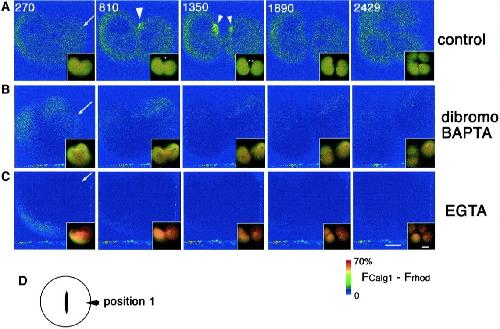 Fig. 8. dibromoBAPTA or EGTA effectively suppresses both Ca wave 1 and 2 without affecting cytokinesis. Pseudocolored time-lapse images showing the change of free [Ca2+]i after Ca chelator injections. Four nanoliters each of the injection buffer alone as control (A), 0.9 mM (final concentration in the cytosol) dibromoBAPTA (B), or 0.9 mM (final concentration) EGTA (C), were injected into dividing eggs during early furrowing at a polar region (D and arrows in AâC), and the effects on both cytokinesis and free [Ca2+]i;(FCalG â FRhod) Ã 1.4, were monitored. The merged raw data for CalG-dx and Rhod-dx are also presented in the right bottom of each pseudocolor image to show the appearance of the embryos. Yellow color represents the resting level of the [Ca2+]i. As the [Ca2+]i was lowered by Ca chelators, the color turned to reddish. The numbers in A indicate times (seconds) after injection. Images in B and C were obtained at the same time points. (A) In the control egg, Ca wave 1 and 2 were detected at 810 s and 1350 s, respectively (arrowheads). (B) Injection of dibromoBAPTA did not alter the free [Ca2+]i significantly as expected from itsKd for Ca ion. In the dibromoBAPTA-injected egg, both wave 1 and wave 2 were suppressed but the first cleavage was not affected or only slightly delayed. The second cleavage of the blastomere on the injection side was inhibited. Deformation occurred frequently around the site of the injection (inset of the picture of 270 s). (C) The injection of EGTA lowered the [Ca2+]i immediately and significantly. Both Ca wave 1 and wave 2 were suppressed. However, the first and second cleavages occurred normally. (D) Position of injection site. Position 1, position away from both ends of the cleavage furrow. Scale bars, 0.2 mm. |