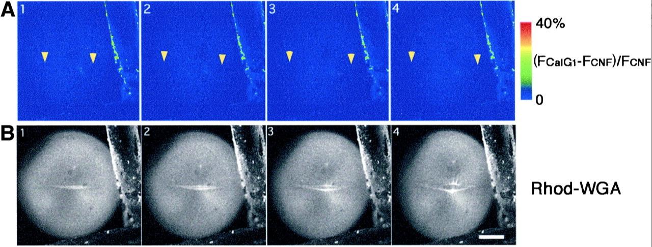 Fig. 2. Dual time-lapse imaging of [Ca2+]i and the newly emerging cleavage furrow. (A) Time-lapse images at an interval of 90 s depict increasing fluorescence intensity of CalG-dx (increasing free [Ca2+]i: (FCalGâ FCNF)/FCNF Ã 2.5) on a pseudocolor scale as indicated by the color bar. The positions of the growing ends in B are indicated with yellow arrowheads. Note that no obvious elevation of the free [Ca2+]i was detected at the growing end of the cleavage furrow. (B) Serial images of a newly emerging and elongating cleav-age furrow stained with rhodamine-WGA (the white line in the middle of the egg). Each image was simultaneously obtained with those shown in A. Scale bar, 0.2 mm. |
