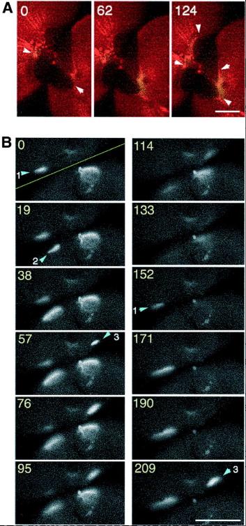 Fig. 6. Ca wave 2 propagates along the border of old and new membranes after completion of cytokinesis. (A) Representative merged image of rhodamine-WGA staining (red) and increasing free [Ca2+]i: (FCalG â FCNF) Ã 2 (green) during Ca wave 2 after completion of the first cleavage. Wave 2 emerged at the animal pole and traversed along the border of old and new membranes. Arrowheads in the image at 0 s indicate the starting point of wave 2, and those in the image at 124 s indicate the wave front. Note that the egg had already divided into two blastomeres before wave 2 first appeared. (B) Gray scale images of increased free [Ca2+]i; (FCalG â FRhod) during a typical wave 2. The yellow line in âtime 0â indicates the position of the division plane. Wave 2 does not propagate continuously, but often skips a distance of several hundred micrometers, reappearing along the border of the two membranes or flickering at some particular site several times. Arrowheads indicate initiation sites of wave 2. At site 1, Ca signal is flickering (the signal is seen during 0â95 s, disappears and then reappears after 152 s). There seemed to be no synchrony between the waves in the two blastomeres. Numbers indicate the recording time (seconds). Scale bars, 0.2 mm. |