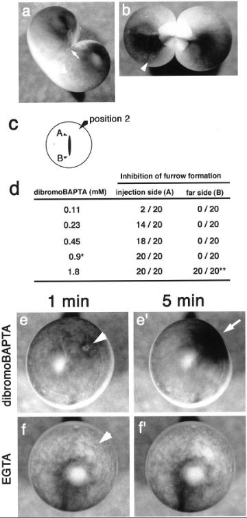Fig. 9. Effect of dibromoBAPTA and EGTA on the cortex of Xenopus eggs. (a and b) Thirty minutes after the injection of 0.45 mM dibromoBAPTA (a) or injection buffer (b) into dividing wild-type Xenopus egg. Arrowheads, injection sites; white arrow, the position of the growing end. (a) Furrow formation was clearly inhibited on the side of the injection. The growing end was drawn back to the center of the egg after its progression had stopped. On the other hand, the furrow progressed normally at the other end. In the control egg (b), both ends grew and the egg cleaved normally. (c) Positions of injection sites. Position 2, injection carried out at a position near the growing end of the cleavage furrow. (d) Dose-dependent inhibition of furrow formation by dibromoBAPTA. Progression of the furrow at the growing ends (A or B) was examined 30 min after injection. â, concentration (0.9 mM) used in Ca monitoring experiment in Figure 8. ââ, at 1.8 mM, progression of the furrow at the end B was very slow, and the egg was severely deformed. Ca buffers were injected into fertilized wild-typeXenopus eggs, and changes of the cortex were monitored 1 min (e and f) and 5 min (eâ² and fâ²) after the injections. Arrowheads in (e) and (f) indicate the positions of injection site. Injection of 1.8 mM dibromoBAPTA (eâ²), induced deformation of cortex and concentration of pigment granules around the injection site (arrow). (f and fâ²) Injection of 6.3 mM EGTA did not cause such contraction in the cortex. |