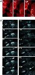 Fig. 4. Neither Ca puffs nor Ca blips appear at the growing end of the cleavage furrow. (a) An egg at an early stage of cytokinesis was labeled with rhodamine-WGA to mark the cleavage furrow, and [Ca2+]i was monitored using Fluo-4. The area indicated by the square in a was scanned for the Fluo-4 fluorescence. Thirty frames were obtained at the speed of 0.78 s/frame. This scan speed is equal to that of the line-scan in Figure 3. After this data collection, 3FIP3 was injected near the scan area. Again 30 frames of scan images were obtained at the same speed in the same area. (b) Rhodamine-WGA staining of the growing end of the cleavage furrow shown in a. The white arrow indicates the position of the growing end of the cleavage furrow. (c and e) Representative single confocal frame scan images, showing increased free [Ca2+]i: (Fn â Fnâ1) à 2 in a pseudocolor scale before (c) and after (e) 3FIP3 injection in the area shown in a. The arrow indicates a Ca blip detected after 3FIP3 injection. (d and f) Patterns of subcortical Ca release before (d) and after (f) 3FIP3 injection. The total Ca signals and their position identified in all 30 frame scans, in the same field shown in a, c, and e are marked (Ã). Ca signals are clearly distinguishable from noise based on their signal mass and diameters (>1.5 μm). Only three signals are detected around the growing end of the cleavage furrow before 3FIP3 injection, whereas 48 Ca microspikes including both Ca blips and Ca puffs were detected in the respective 30-frame scans after injection. Scale bar, 25 μm. |