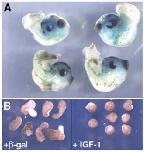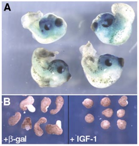 FIG. 3. Overexpression of IGF-1 inhibits convergent-extension movements. (A) Dorsal injections of IGF-1 mRNA (1–3 ng in one dorsal blastomere at the 4-cell stage) lead to dorsally curved embryos with truncated posterior tissue. (B) In the presence of activin, control ectodermal explants derived from embryos injected with -galactosidase RNA (1.5 ng/blastomere at the 2-cell stage) elongate (left panel), but explants derived from IGF-1-injected embryos (1.5 ng/blastomere) remain round (right panel).