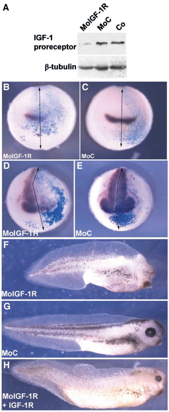 FIG. 5. IGF signaling is required for head formation. (A) Western blot analysis of IGF-1R expression in embryos at late blastula stage (stage 9) injected with Mo (20 ng per blastomere at the two-cell stage) specific to the receptor (MoIGF-1R) or control Mo (MoC) (Co, noninjected embryo). -Tubulin is shown as a loading control. (B–E) Whole-mount in situ hybridization analysis of embryos injected in one dorsal blastomere at the four-cell stage with 20 ng of MoIGF-1R shows a strong inhibition of XBF-1 expression (B, embryo stage 13) and NCAM expression (D, embryo stage 19) on the injected side (right). The expression patterns of these two genes are normal in MoC-injected embryos (C, XBF-1; E, NCAM). (F–H) Four-cell embryos were injected in the two dorsal blastomeres with 20 ng of the Mo indicated. The embryo injected with MoIGF-1R shows microcephaly and no apparent eyes (F), whereas the embryos injected with MoC are normal (G). The coinjection of 0.3 ng of IGF-1R mRNA with MoIGF-1R rescues the morpholino-induced phenotype (H).