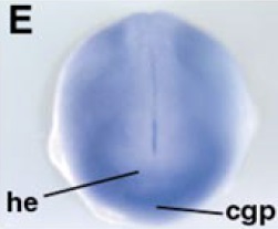 igf1 (insulin-like growth factor 1 (somatomedin C)) gene expression in Xenopus laevis embryo, assayed via in situ hybridization, NF stage 12, dorsal view, anterior down.