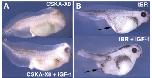 FIG. 7. IGF-1 inhibits Wnt-posteriorizing activity after MBT. (A) Injection of IGF-1 mRNAs (1.5 ng per dorsal blastomere, four-cell stage) rescues posteriorization induced by injection of CSKA-X8 plasmid (75 pg per blastomere). (B) Coinjection of IGF-1 mRNA (2 ng) with tBR mRNA (0.5 ng) into one ventral blastomere at the four-cell stage induces an ectopic head with a visible eye (arrow), unlike tBR mRNA alone which induces only a partial axis with no head structures (arrow).