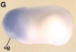 FIG. 1. Expression of IGF signaling components during Xenopus development. (A) RT-PCR analysis of IGF-1 and IGF-2 transcripts throughout development. (B) RT-PCR analysis of IGF-1 expression at early neurula stage (D, dorsal; V, ventral side of the embryo). (CâG) IGF-1R mRNAs detected by in situ hybridization (bl, blastopore; he, head; cgp, cement gland primordium; cg, cement gland). Expression is first detected at the end of the gastrulation (stage 12) in the presumptive dorsal side of the embryo (C) but excluded from the ventral part of the embryo (D). During neurulation, transcripts are present in the head region and in the anteriormesoderm, but are not detectable in the neural tube and the ventral part of the embryo (E, frontal view; F, lateral view). At tailbud stage, transcripts are present in the head and the anterior part of the neural tube (G).