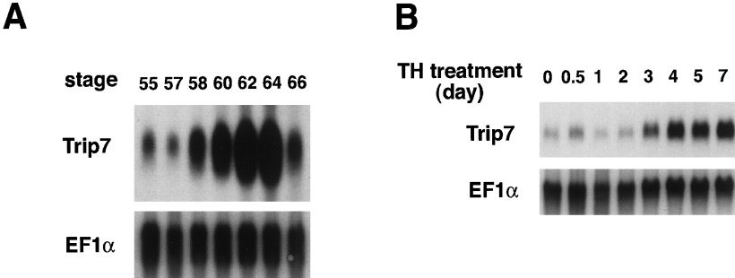 Thyroid hormone (TH) affects biological processes by regulating gene transcription through TH receptors (TRs). In the presence of TH, TR activates target gene transcription by recruiting one or more transcription coactivators belonging to diverse groups. Here, we demonstrate that during TH-dependent anuran metamorphosis, one such coactivator gene, the Xenopus laevis homolog of human Trip7, is up-regulated by TH. Kinetic studies suggest that Xenopus Trip7 is most likely induced indirectly by TH in a tissue-dependent manner. In the intestine, which undergoes extensive remodeling as the animal changes from being herbivorous to carnivorous, Trip7 is expressed at high levels during but not before or after metamorphosis. It is also up-regulated in other growing or remodeling tissues such as the brain and limb but not in degenerating tadpole tail skin. By using frog oocyte as a model, we show that Trip7 influences basal transcription in a chromatin structure-dependent manner but enhances the function of liganded TR regardless of the chromatin structure of the target promoter. In vitro studies indicate that Trip7 interacts directly with TR. These results suggest that during Xenopus metamorphosis, TH up-regulates, albeit indirectly, Trip7 to enhance TR function during larval-to-adult tissue transformation.