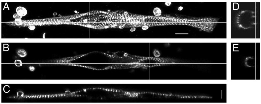 space during SDT production and myofibrillogenesis during the first 48 h in culture. Vertical line is the plane of section for the image shown in E. (C) Avertical slice